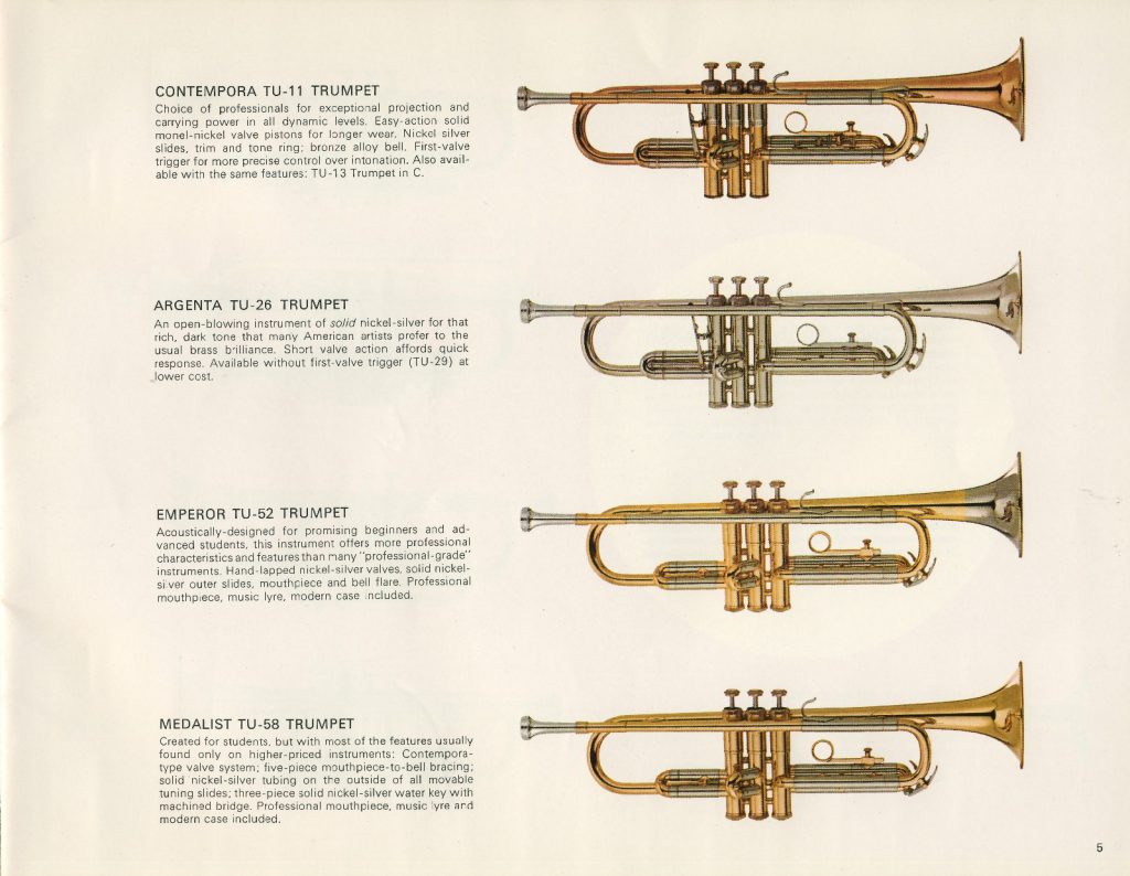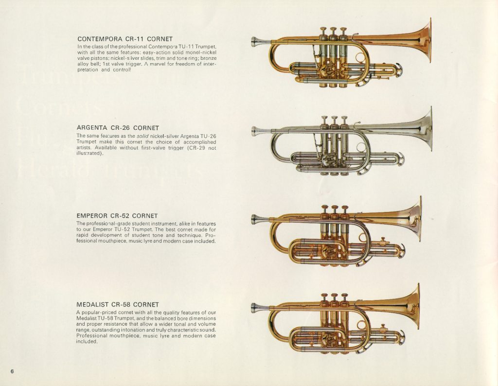 The strong focus on student musicians continues, but CMI restores the "best-better-good" order of presenting instruments, with Contempora, Argenta, Emperor and Medalist models at the core of the catalog. Instrument descriptions are minimal and CMI retained the new numbering scheme introduced by Richards/RMC.