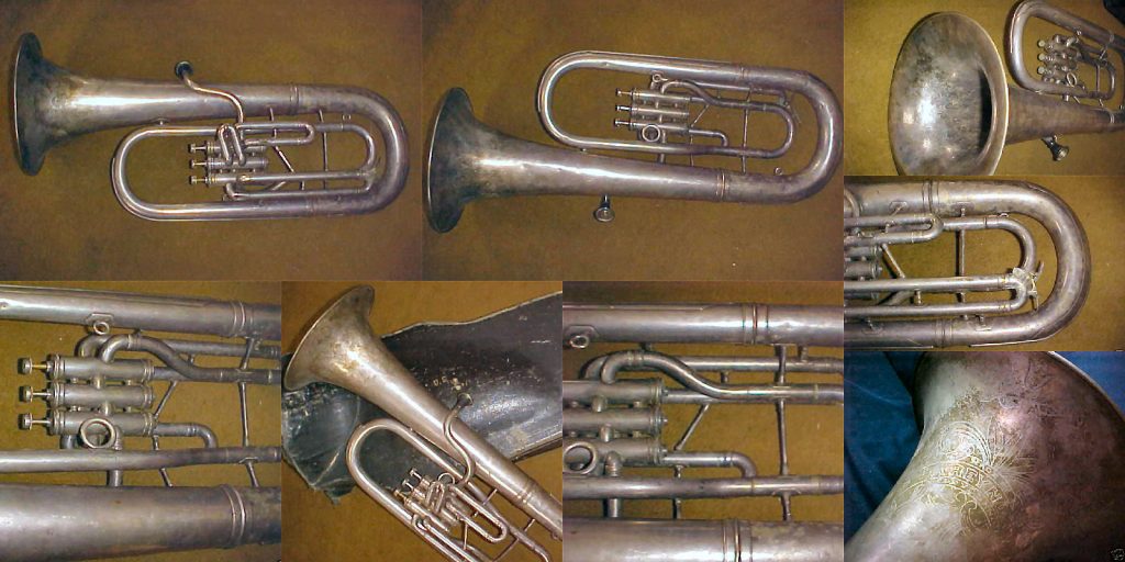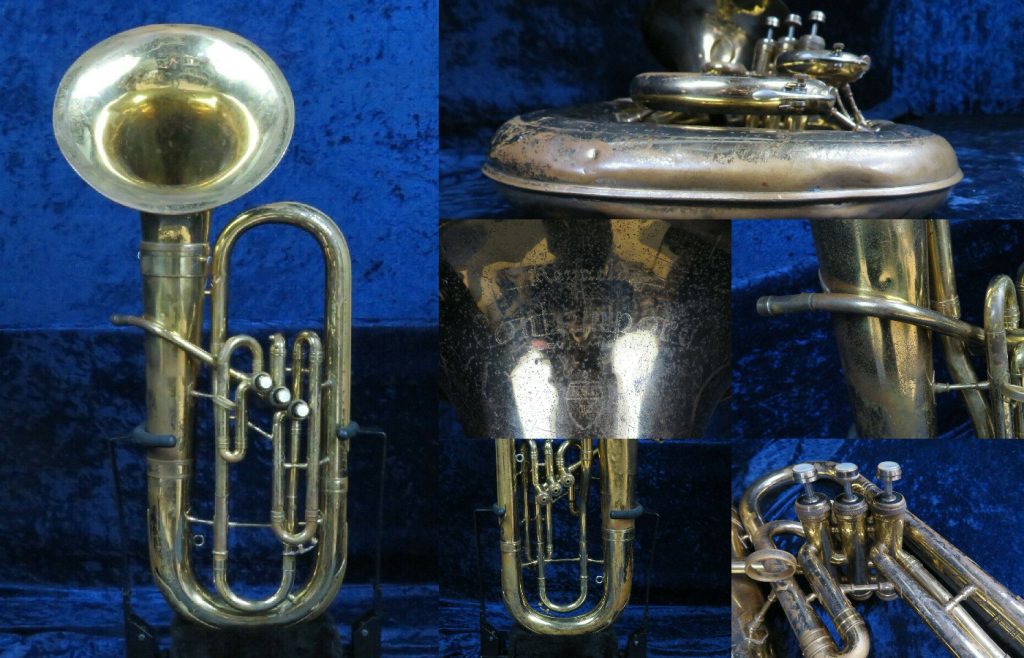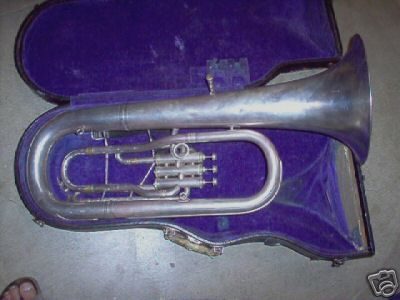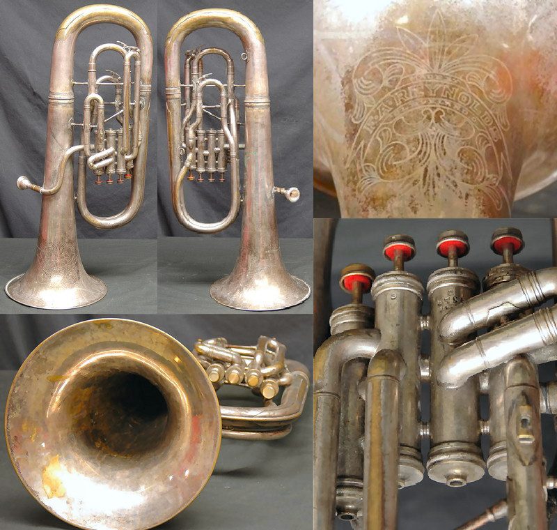 Because the "F.A. Reynolds" engraving on baritones (and other background and low brass instruments) is the same between domestic models and models created for the U.S. Army (see below), it is difficult to say whether an example was made for one or the other unless you can clearly see the "U.S." engraving near the bell rim (or not). I've included models below where the "U.S." is not visible and models where it is in the WW2 section, knowing that they may actually be the same.