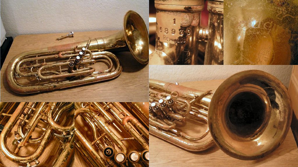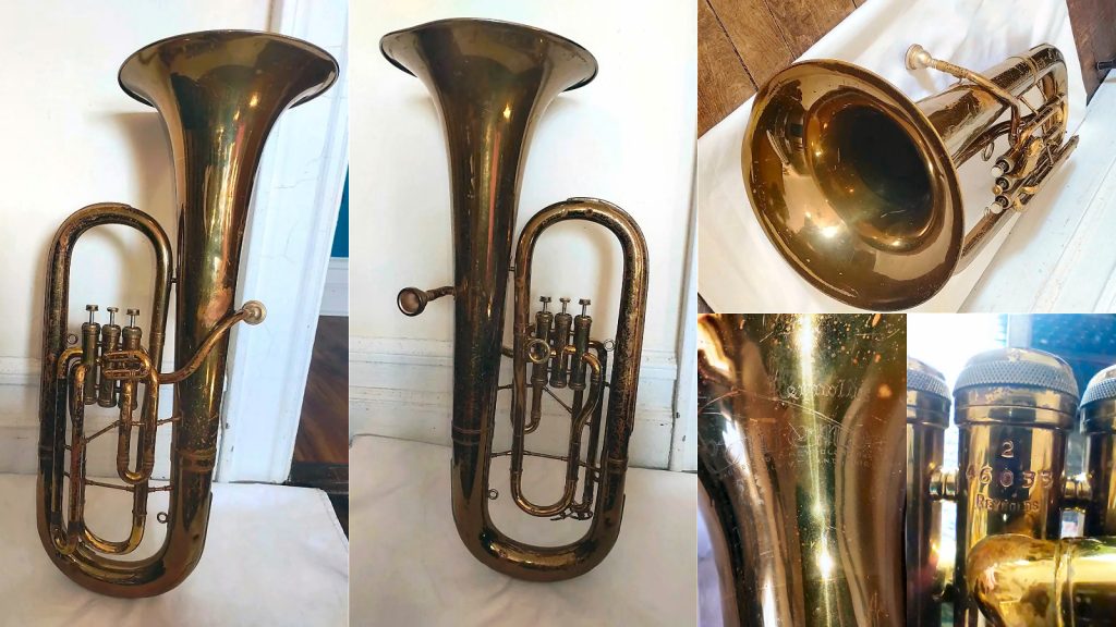 Baritones were a staple in the Reynolds catalog from beginning to end, and had some of the most variations of instrument configurations—upright vs front-facing bells, three or four piston valves, top-action vs side-action valve placement and compensating tuning mechanisms were all options at one time or another.