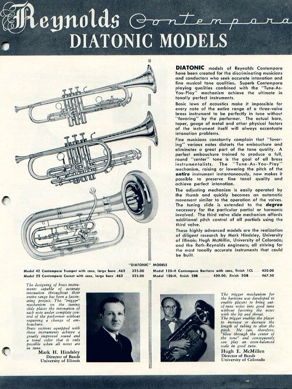 The core Reynolds baritone line consisted of upright bell and bell front models, each with either three or four standard piston valves. As early as c.1950, Reynolds was experimenting with additional tuning mechanisms that provided finer pitch control than normally available through setting each valve's tuning slides. Model 120T added a tuning trigger to compensate individual notes played with the first valve—a similar mechanism had been added to Contempora trumpets and cornets. Model 120H attached a mechanism to the main tuning slide, the function of which was adapted to the trumpets and cornets on the "Diatonic" models, later "Renascence".