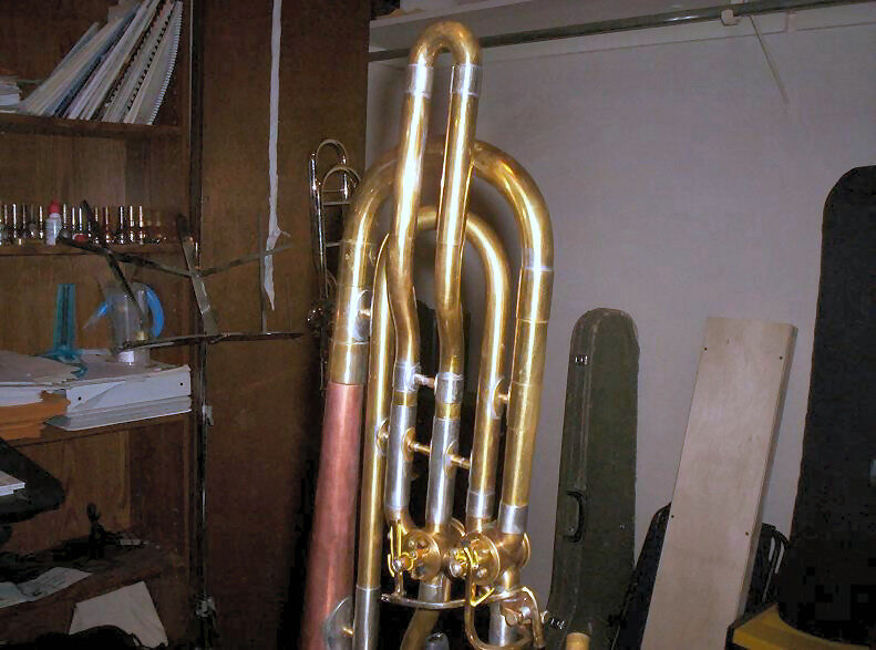 As a result of the discussions with Kahila, Reynolds built three prototypes in late 1957 and brought in Ostrander and Counihan for testing and feedback. The three musicians met over the winter of 1957-58 to discuss the prototypes—they requested changes to the placement of braces around the valve section and suggested the use of saxophone-style key rollers to aid the dependent dual-trigger design. Reynolds began work on implementing their recommendations and that fall, after playing the prototype on a summer tour throughout Latin America, Ostrander sent his model back to the factory to be upgraded. Ostrander's instrument was serial number 49479 and valued at $500 (list price in 1958)—unlike Kahila and Counihan's prototypes with the standard Reynolds bronze bell, Ostrander had requested a yellow brass bell.