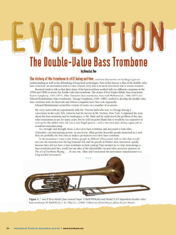 To grossly summarize, F.E. Olds produced the first B♭ bass trombone with two valves permanently attached in 1938, but it was undersized and never caught on in the professional symphonic world outside of the Los Angeles studios. In 1952, Edward Kleinhammer (Chicago Symphony) had an instrument repairman convert an unspecified bass trombone (Conn 70H?) into a double-valve bass and later worked with Holton on the TR-180. Lawrence Weinman (Minneapolis Symphony) convinced Vincent Bach to make the first prototype of the Bach 50B2 in 1956, using the Olds bass as a reference point. And Kahila, with Ostrander and Counihan, worked with Reynolds in 1957-58 to bring the Contempora double-valve bass to market. While neither first or wholly original, the "Stereophonic" firmly stands in this historical stream of experimentation and innovation.