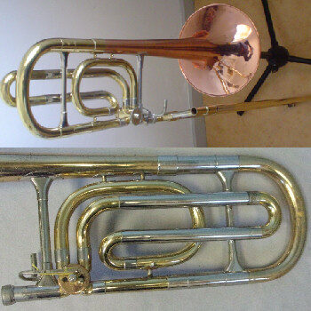 Whereas Kahila ultimately preferred the single-valve "Philharmonic" bass trombone for daily playing, Allen Ostrander quickly championed the advantages of the “Stereophonic” double-valve design for his NYPO playing and teaching methods. An image of the Reynolds double-valve section appears on the front of my copy of Ostrander’s “Double-Valve Bass Trombone Low Tone Studies” method book. Ostrander also appears to have been somewhat of a gearhead, ordering a second Reynolds horn and mixing and matching bells and valve sections from different manufacturers to see how they played. Reportedly, he attached an old Conn 9½" yellow brass bell and .547/.562" dual-bore slide for the majority of his NYPO playing.