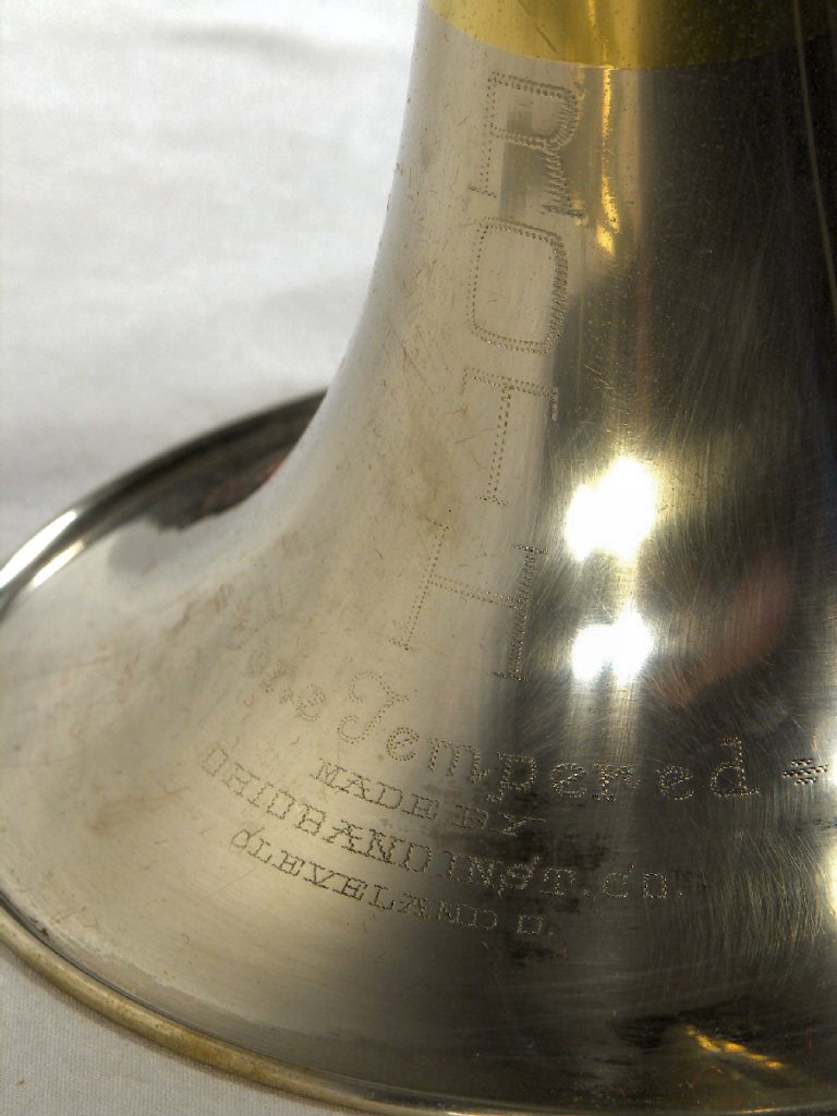 It was under this business framework that deluxe versions of the "Made by Ohio Band" Roth trumpet, cornet and trombone were introduced c.1947-48 with a new feature—a nickel-silver bell flare fused to a brass bell stem. These "Tone Tempered" bells are identical to the same metallurgical marriage that Olds introduced with their "Brilliant Bell" on the 1948/49 Studio line, launched a short time after Foster Reynolds had joined F.E. Olds in California. It's yet unknown if this was coincidence, collaboration or competition between his former and current companies.