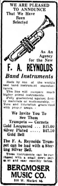 In the summer of 1938, Reynolds again exhibited the F.A. Reynolds line of band instruments at the NAMM convention (Chicago, July 30–August 4). Both F.A. Reynolds and Scherl & Roth were also exhibiting Regent band instruments made under the Ohio Band label. Reynolds, Roth and Scherl are all listed as company officers in the same roles described above.